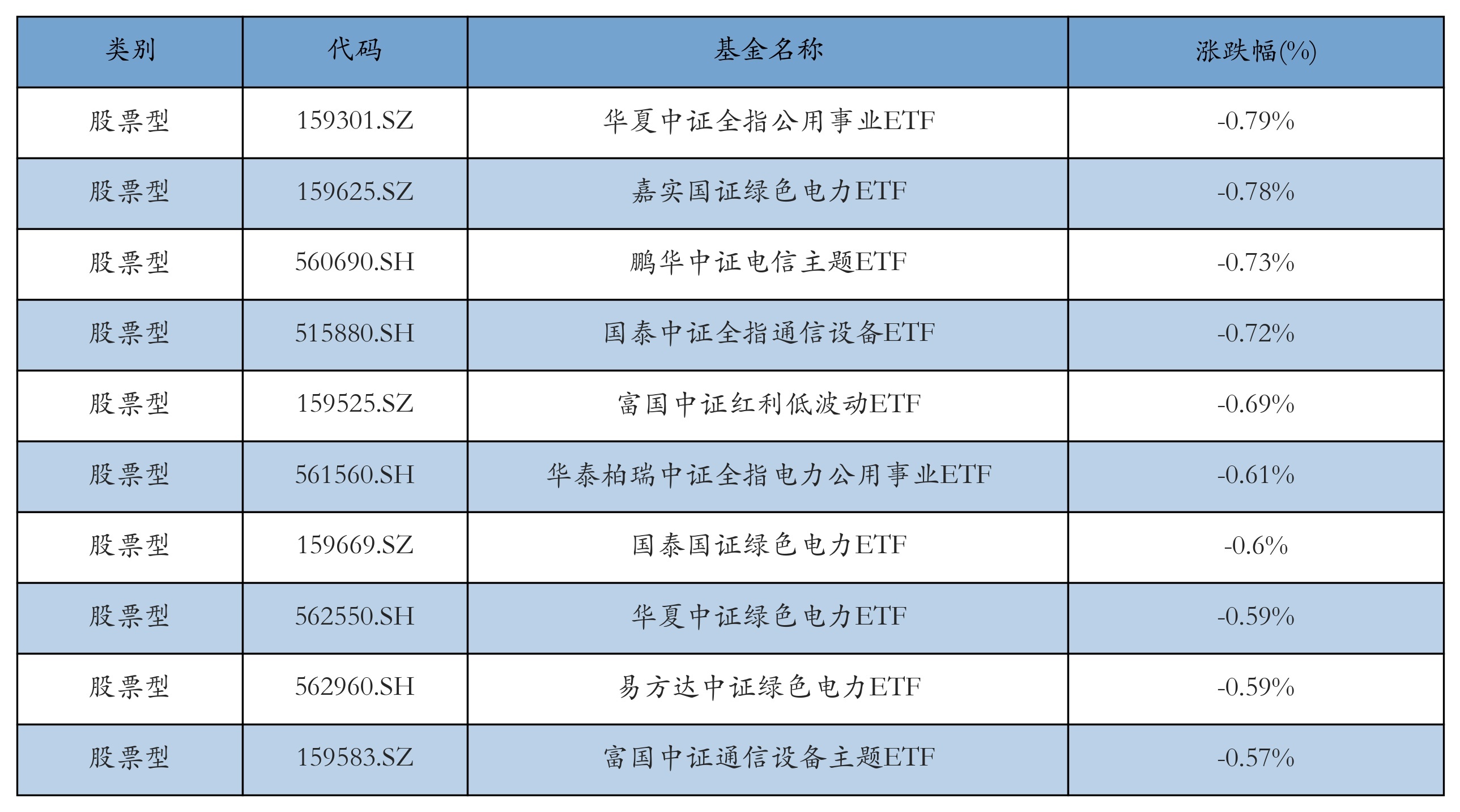 昨日股票型ETF跌幅最大的3只ETF及其收益率分别为:华夏中证全指公用事业ETF(-0.79%)、嘉实国证绿色电力ETF(-0.78%)、鹏华中证电信主题ETF(-0.73%)。跌幅前10详情见下表: