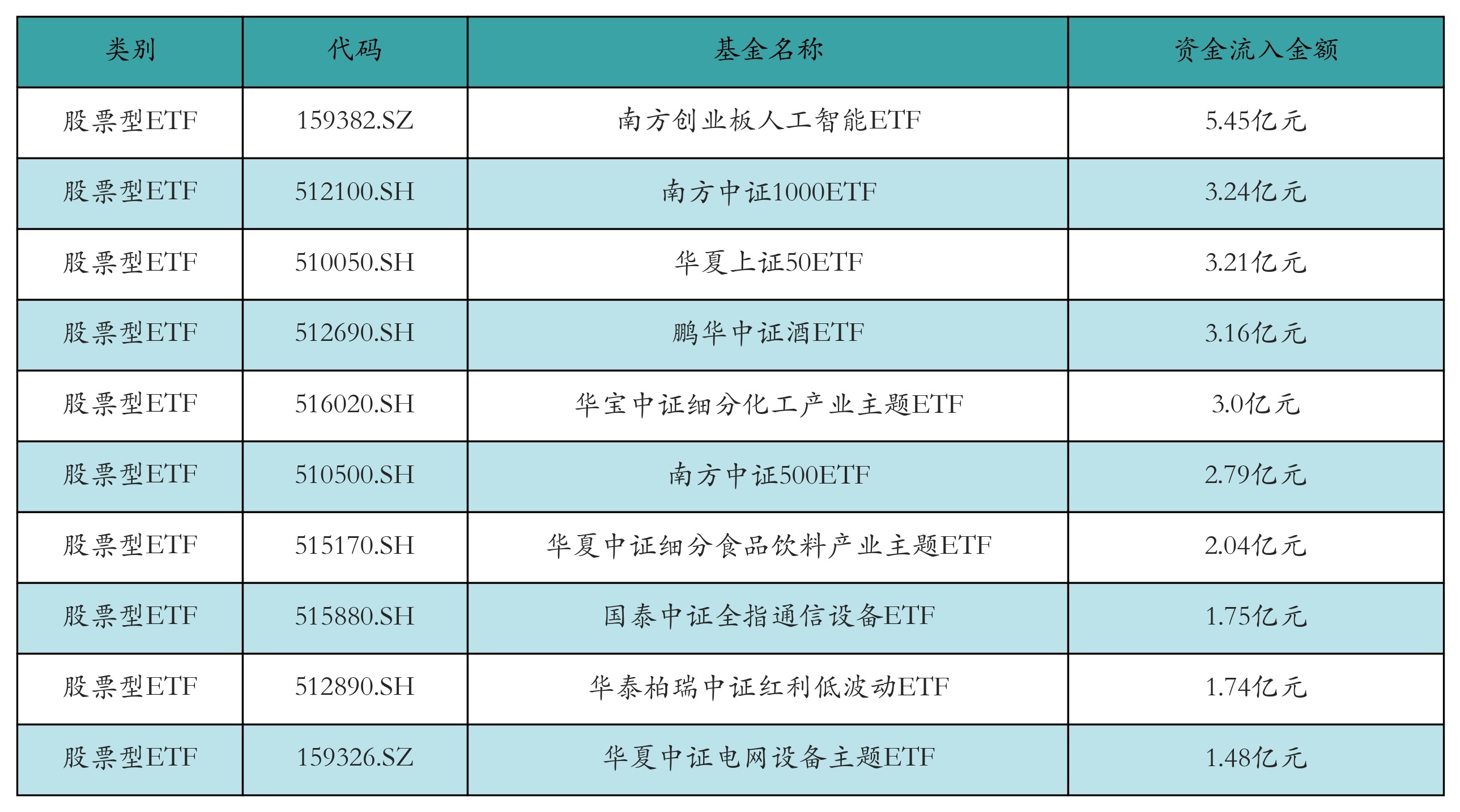 昨日股票型ETF资金流入最多的3只ETF及其流入金额分别为:南方创业板人工智能ETF(流入5.45亿元)、南方中证1000ETF(流入3.24亿元)、华夏上证50ETF(流入3.21亿元)。资金流入前10详情见下表: