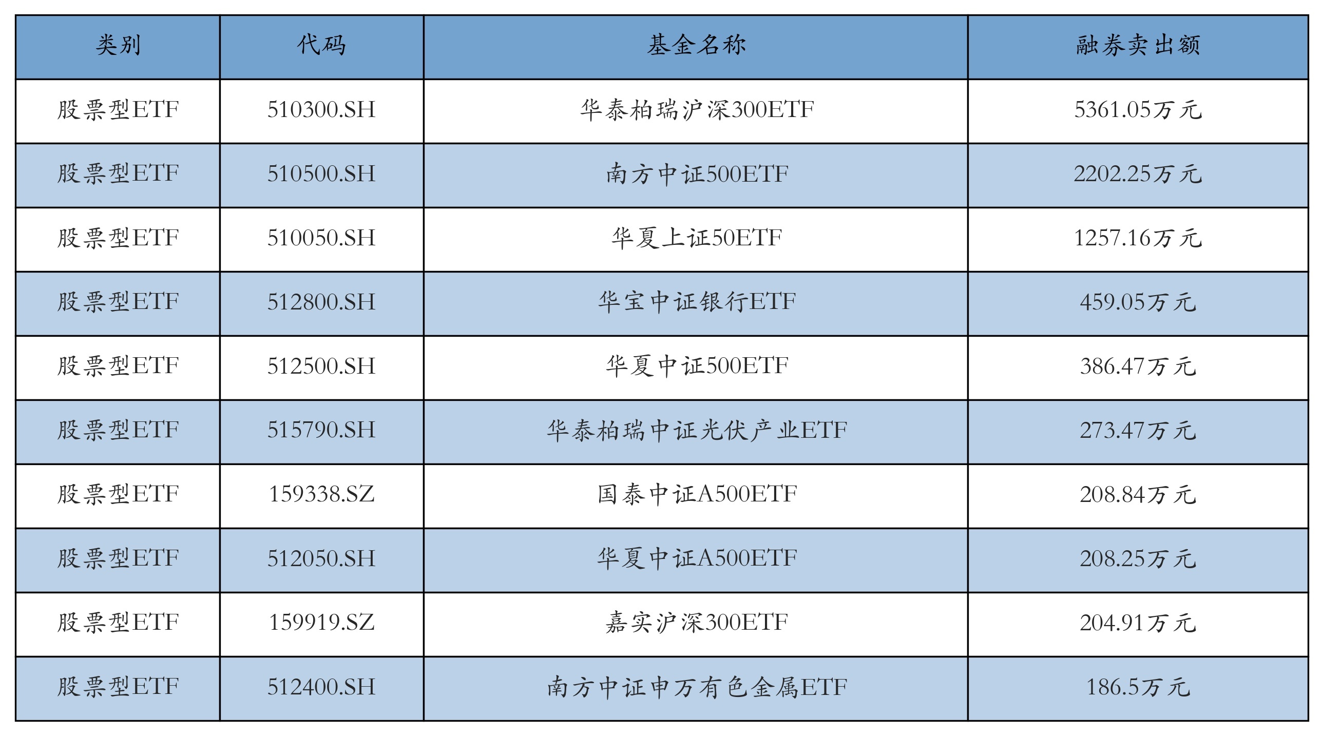 昨日股票型ETF融资卖出额最高的3只ETF及其卖出金额分别为:华泰柏瑞沪深300ETF(5361.05万元)、南方中证500ETF(2202.25万元)、华夏上证50ETF(1257.16万元)。融券卖出额前10详情见下表: