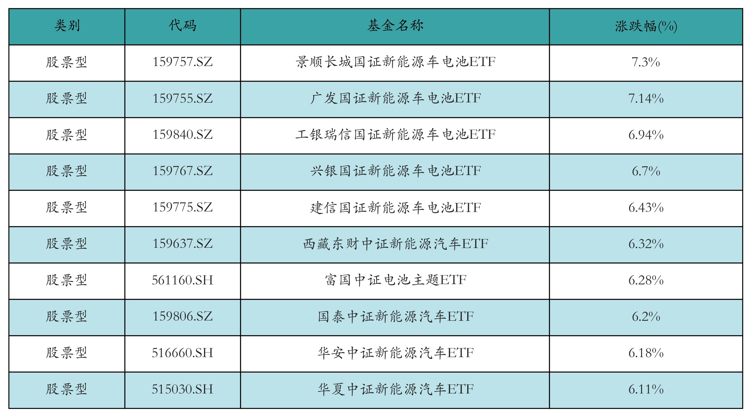 昨日股票型ETF涨幅最高的3只ETF及其收益率分别为:景顺长城国证新能源车电池ETF(7.3%)、广发国证新能源车电池ETF(7.14%)、工银瑞信国证新能源车电池ETF(6.94%)。涨幅前10详情见下表: