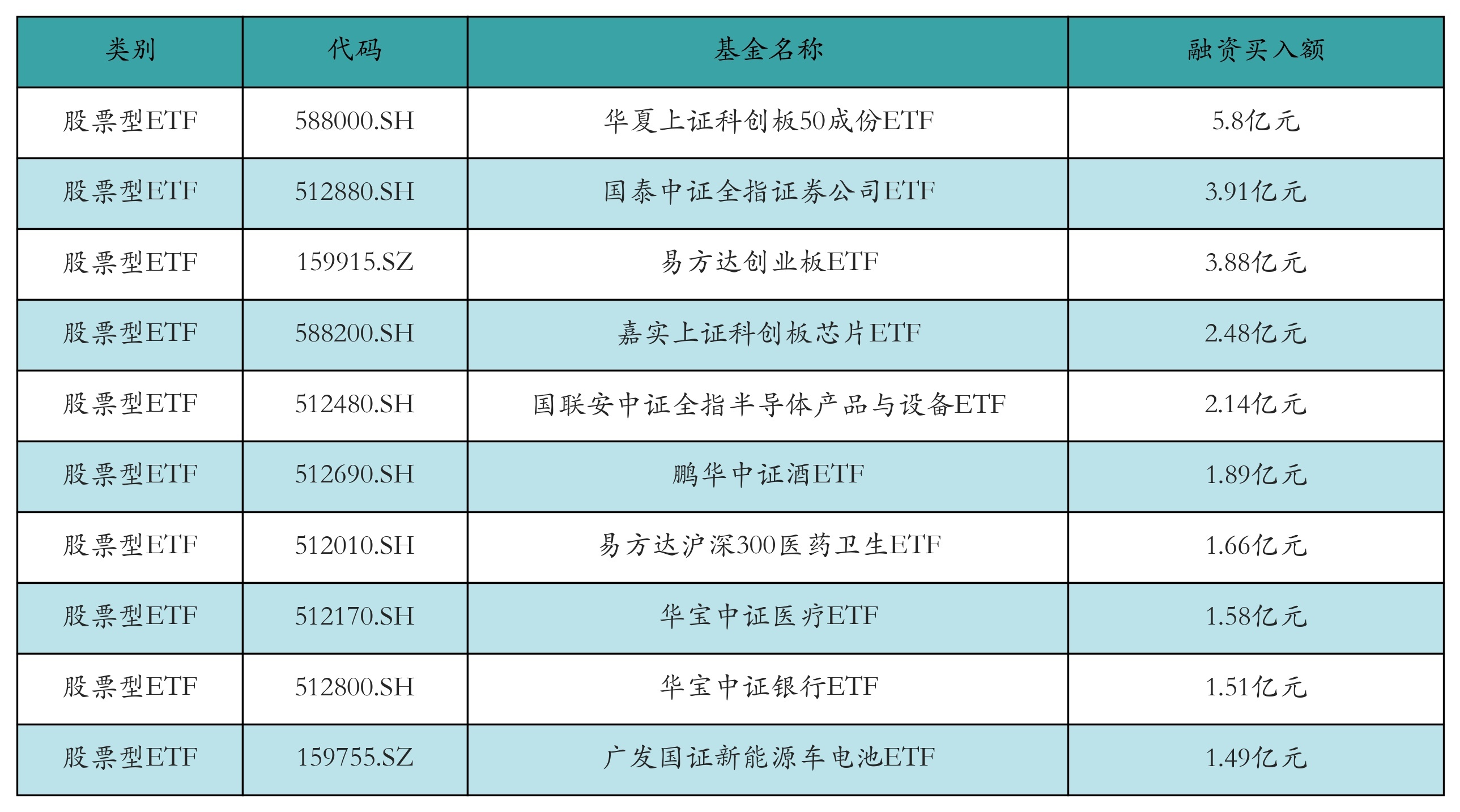 昨日股票型ETF融资买入额最高的3只ETF及其买入金额分别为:华夏上证科创板50成份ETF(5.8亿元)、国泰中证全指证券公司ETF(3.91亿元)、易方达创业板ETF(3.88亿元)。融资买入额前10详情见下表: