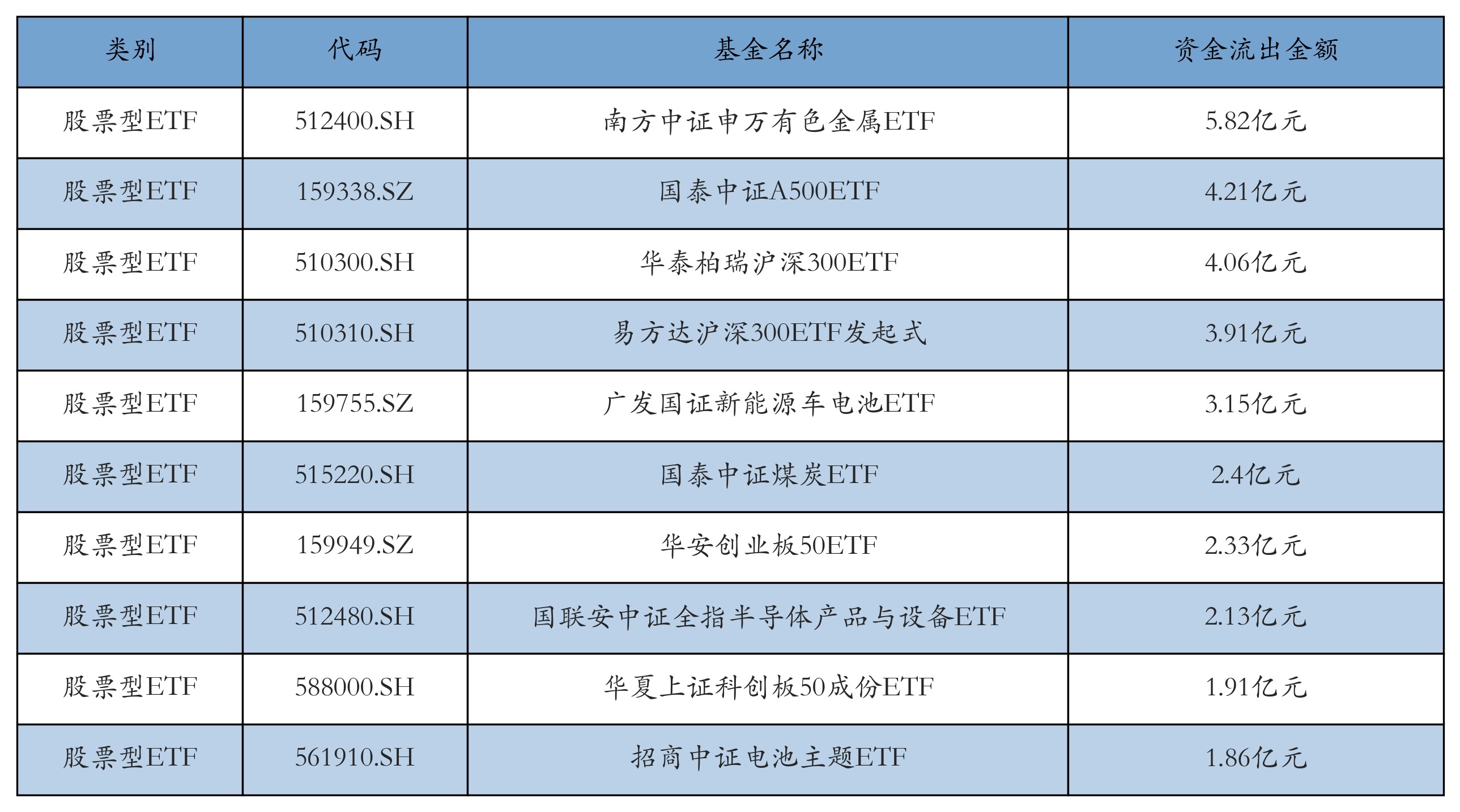 昨日股票型ETF资金流出最多的3只ETF及其流出金额分别为:南方中证申万有色金属ETF(流出5.82亿元)、国泰中证A500ETF(流出4.21亿元)、华泰柏瑞沪深300ETF(流出4.06亿元)。资金流出前10详情见下表: